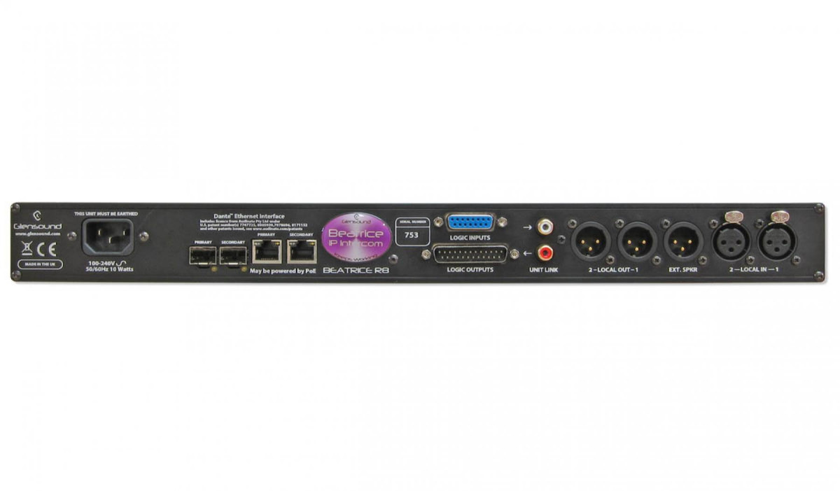 It is part of our Beatrice intercom system that utilises the reliable and proven Dante network audio transmission protocol to allow real time distribution of uncompressed audio across standard networks. It is also AES67 compliant. As such the BEATRICE R8 is fully compatible with other manufacturers’ equipment using the Dante and/ or AES67 protocols.