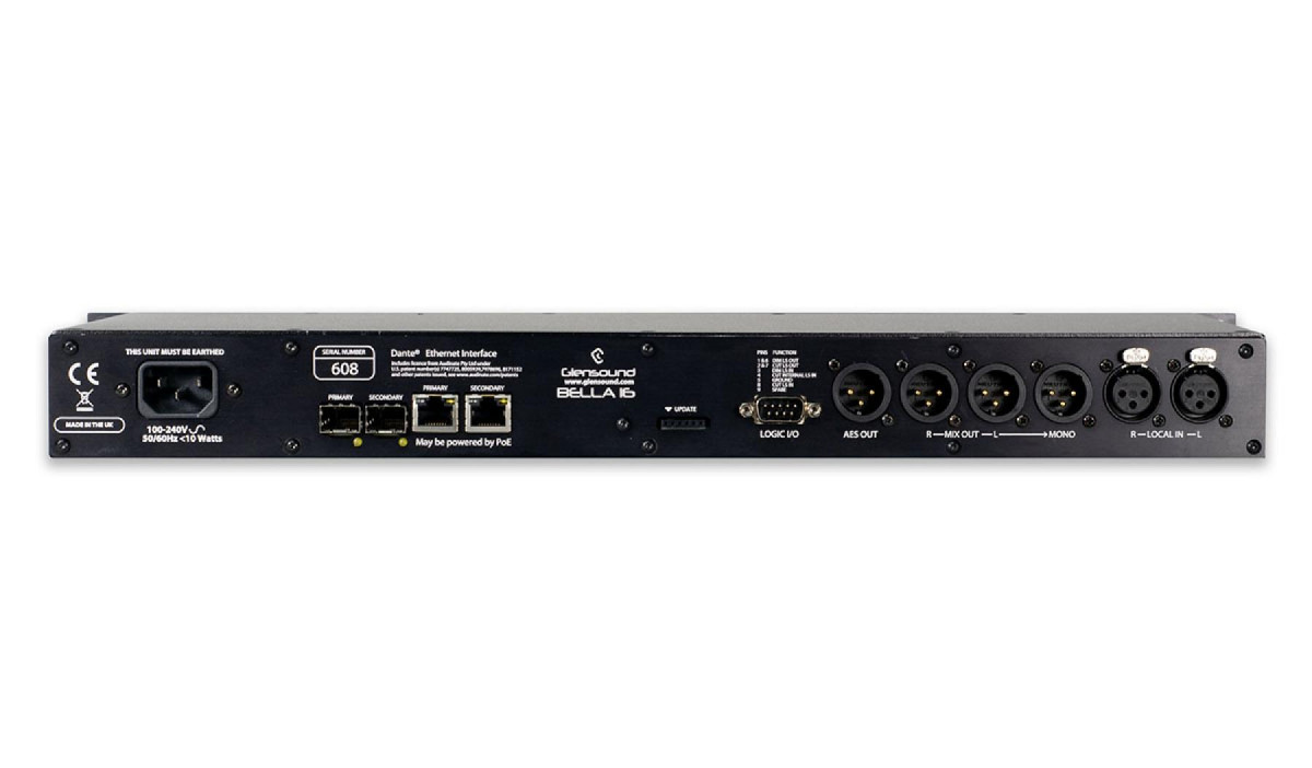 Our widely used Dante/ AES67 network interface is implemented in the Bella 16. It features 4 network ports, 2 x copper and 2 x SFP slots (normally used for fibre). These network ports can be set to operate in fully redundant mode or as a network switch for connecting to other equipment.