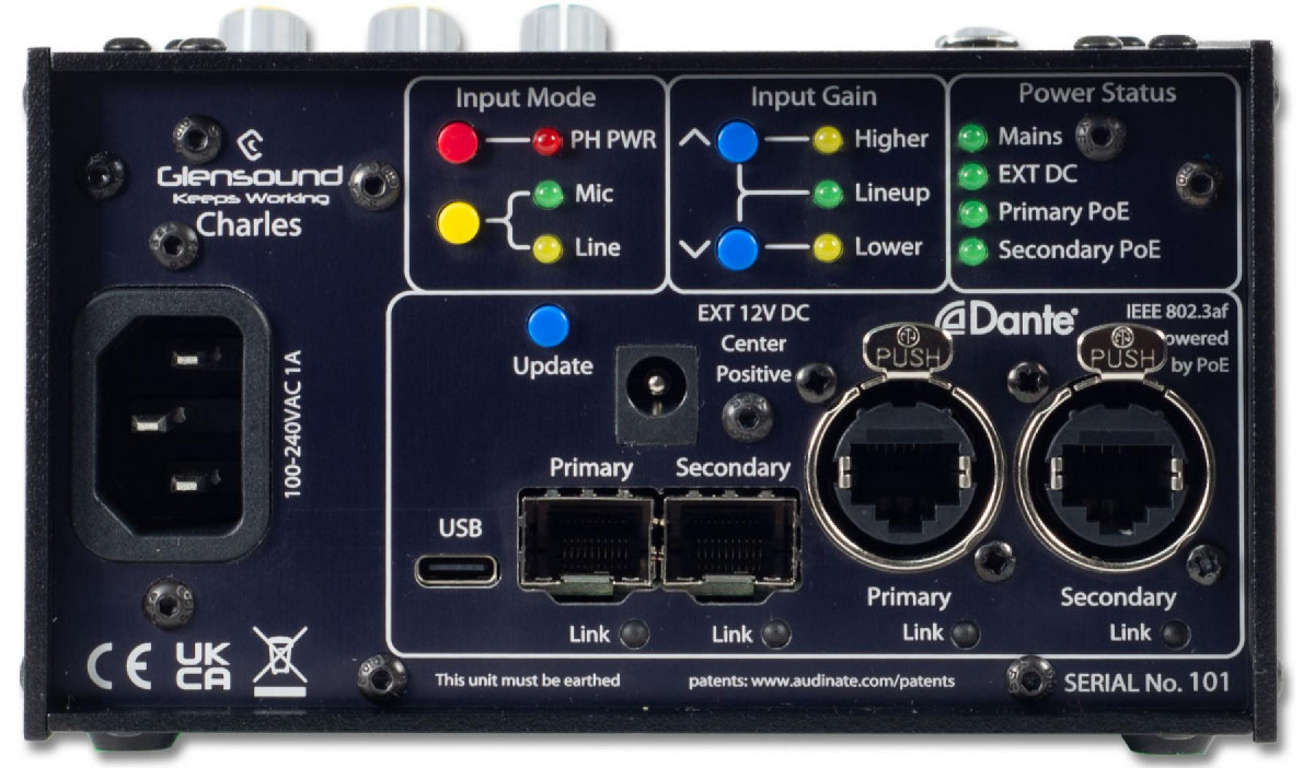 The headphone amplifier on the Charles is very high performance delivering high intelligibility on a variety of headhones and headsets. Headphones between 32-1000 ohm are automatically balanced to give a consistent output level across the range of the volume control. Stereo and mono earpieces can also be used.