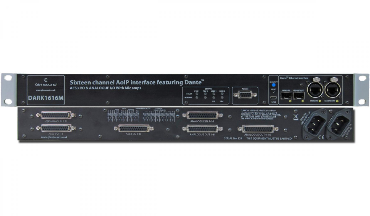 Being designed for resilient broadcast applications the DARK1616M features both redundant power supplies and redundant Dante network links with link status GPOs (general purpose outputs (solid state relays)). Both primary and secondary network links are provided with both magnetic (copper RJ45) and fibre (SFP) interface connections. The Dante system itself provides a completely transparent redundant link system which means that if the DARK1616M lost its primary link circuit the secondary link would automatically take over with no loss of audio.