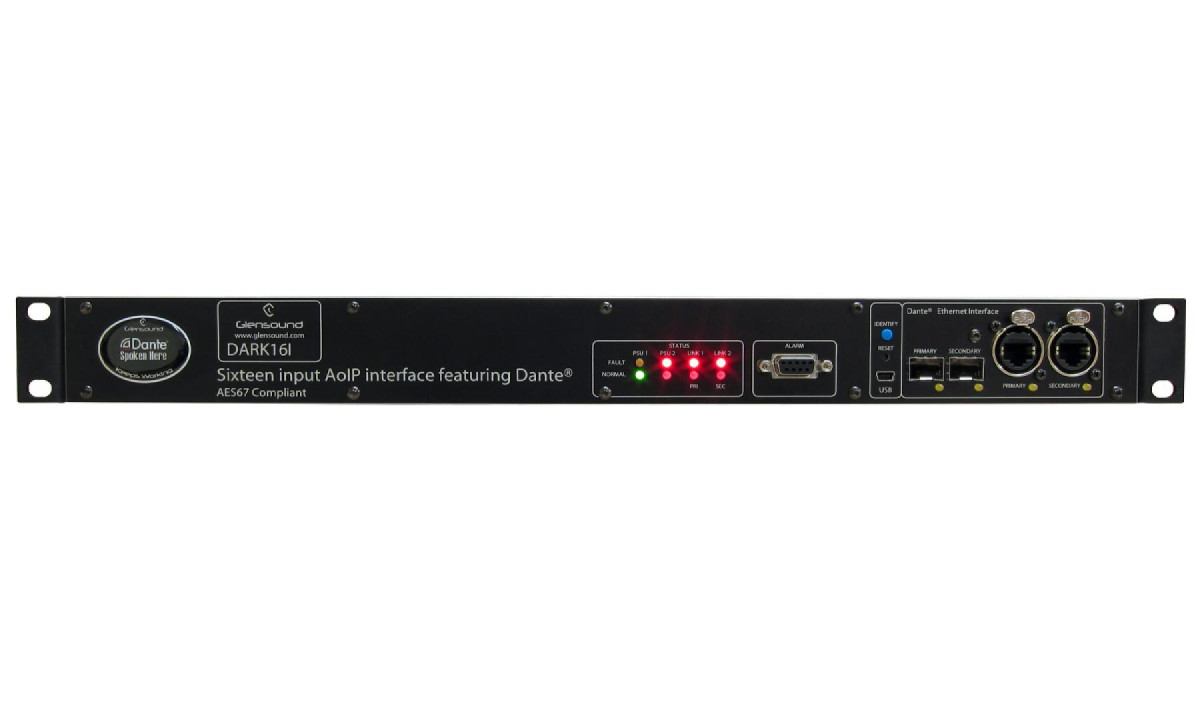 Being designed for resilient broadcast applications, the DARK16I features both redundant power supplies and redundant Dante network links with link status GPOs (general purpose outputs (solid state relays)). Both primary and secondary network links are provided with both magnetic (copper RJ45) and fibre (SFP) interface connections. The Dante system itself provides a completely transparent redundant link system which means that if the DARK16I lost its primary link circuit the secondary link would automatically take over with no loss of audio.