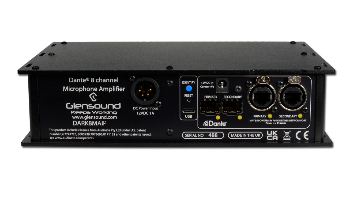 The DARK8MAIP (Microphone Analogue Input with phoenix connectors) is a very powerful Dante/ AES67 network audio interface, in a robust stage box/ throw down style. It has 8 off low noise mic/line inputs which are remotely controlled by a Windows 10/11 app. The outputs of the microphone amplifiers are transmitted on a fully redundant Dante/ AES67 network interface.