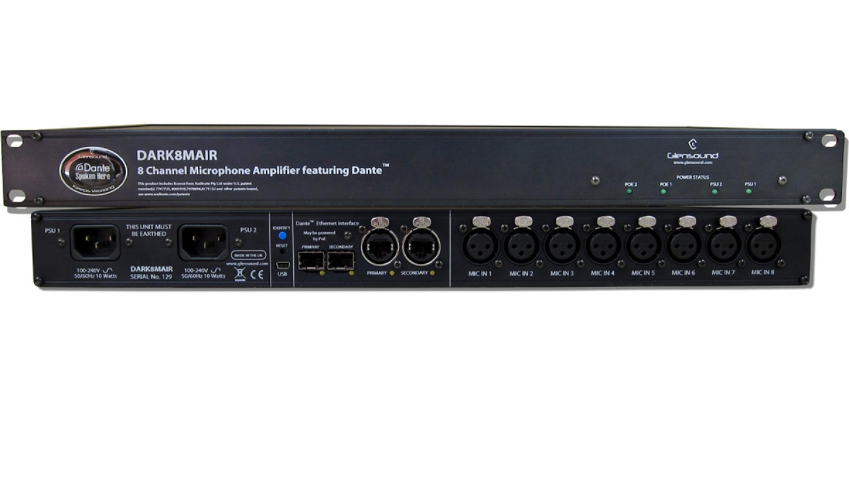 The DARK8MAIR (Microphone Analogue Input Rackmount) is a very powerful Dante/ AES67 network audio interface, in a robust stage box/ throw down style. It has 8 off low noise mic/line inputs which are remotely controlled by a Windows 10 app. The outputs of the microphone amplifiers are transmitted on a fully redundant Dante/ AES67 network interface.