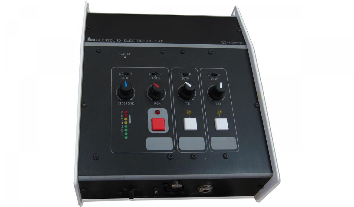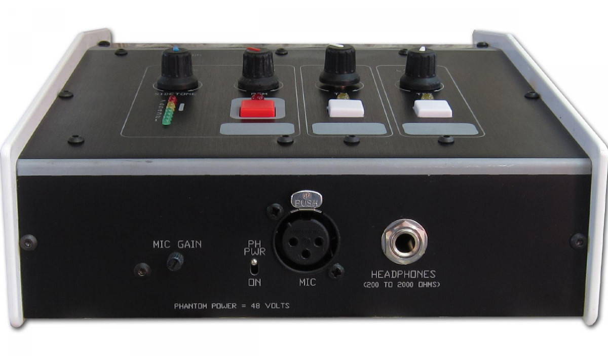 There are three audio inputs with a variable pot for headphone monitoring for a single commentator, with a control for adjusting sidetone level in the headphones. All pots have left/both/right headphone switching so to adjust any input to either side of the headphones. The operator has a single 6.35mm headphone socket. There is a 7 segment LED PPM meter.