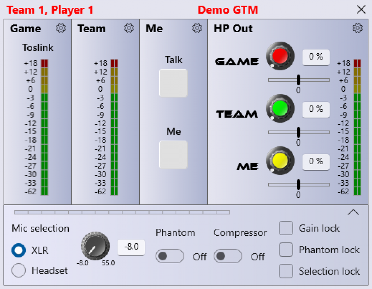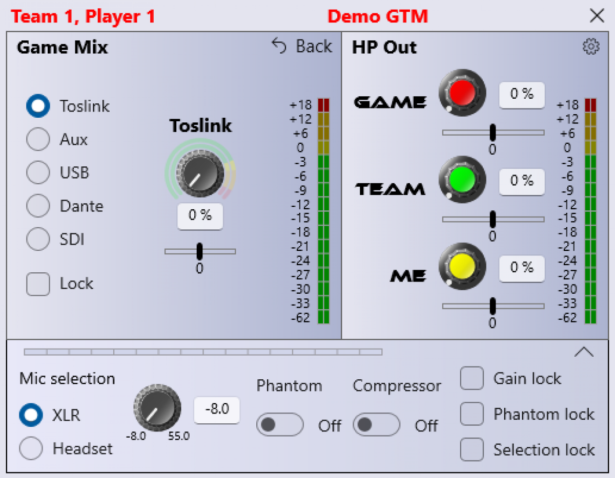 The GTM combines the multiple functions required for the interfacing and communications required in eSports tournaments into one simple to use device. GTM provides the interface for the gamers, provides the intercom mix, and allows remote control by tournament engineers. There are separate modes that also mean the GTM can be used by the Coaches, Referees, and arena Announcers.