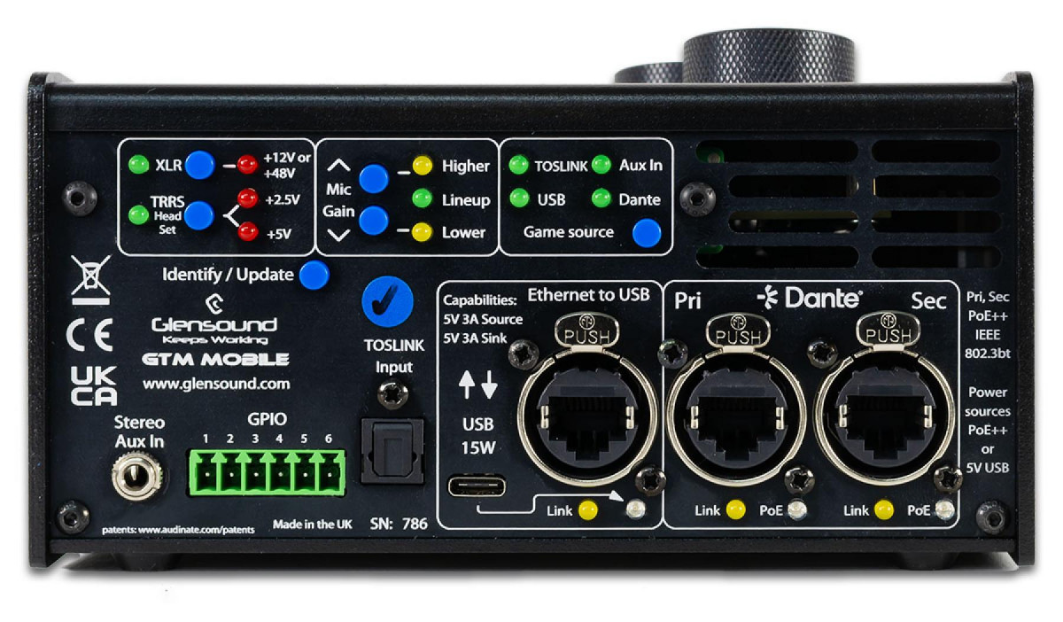 The GTM Mobile also includes an enhanced PC USB interface. There are 2 pairs of audio channels available from the PC for monitoring. The GTM Mobile can also be powered from the PC when connected to a USB C with PD. Please note that in this mode, mobile phone charging is not available unless the PoE port has PoE++ power..
