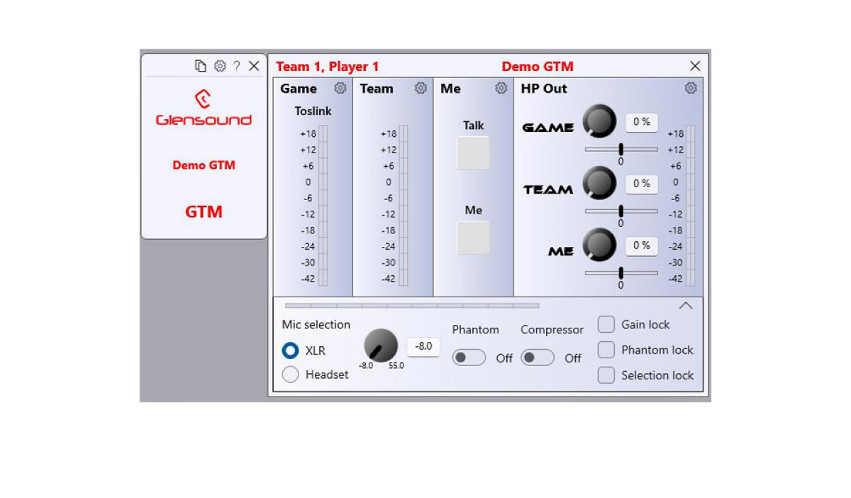 The GTM combines the multiple functions required for the interfacing and communications required in eSports tournaments into one simple to use device. GTM provides the interface for the gamers, provides the intercom mix, and allows remote control by tournament engineers. There are separate modes that also mean the GTM can be used by the Coaches, Referees, and arena Announcers.
