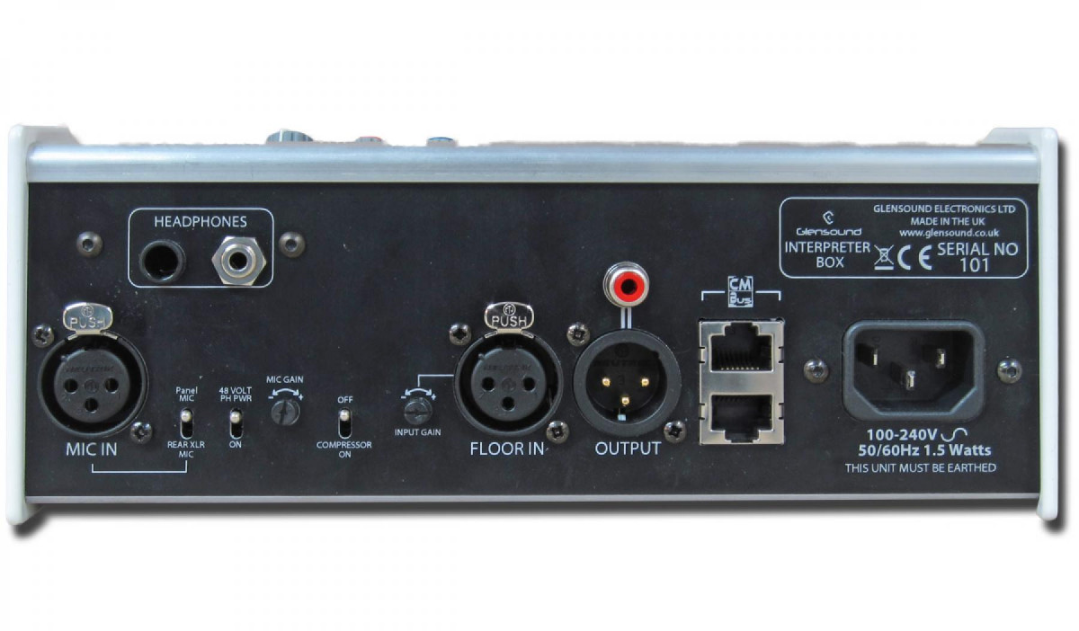 There is a single headphone amplifier that is available on a 6.35mm jack socket or on a 3.5mm jack socket. These connections are paralleled and available via the front panel or the rear panel. There is an external (floor) input to monitor the audio to be interpreted. You can also monitor a separate Interpreter Box (language) - see detail under CM Bus below. The monitored audio can be adjusted for level and has two band EQ.