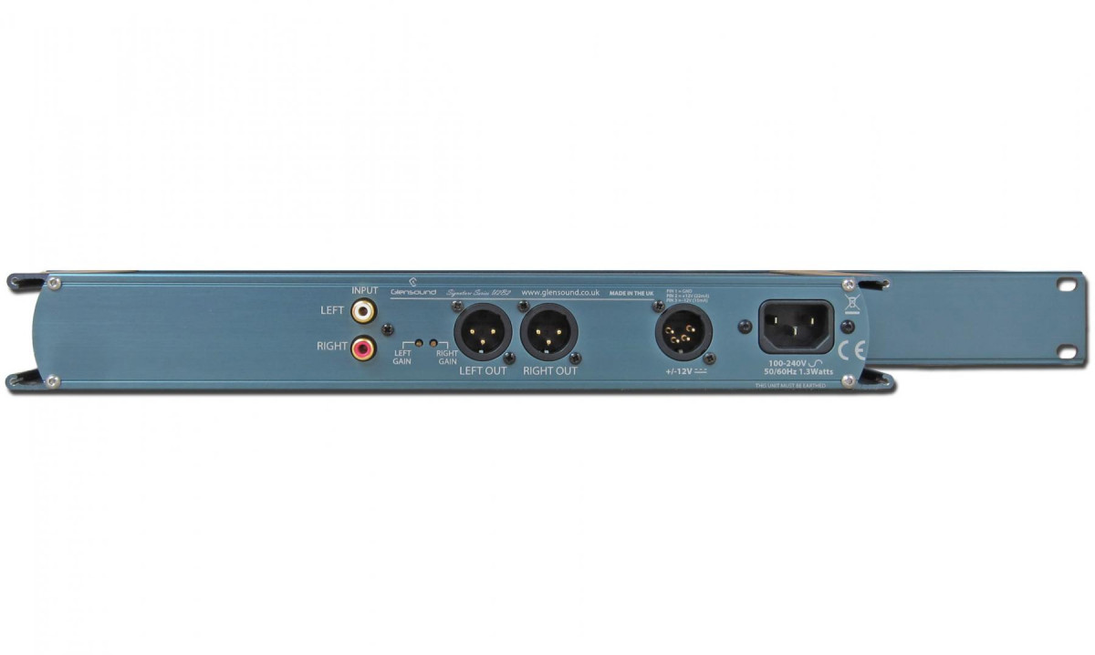 The stereo audio input (which can work as dual mono) is on gold plated RCA phono connectors. This input is electronically isolated with RF filters to prevent extraneous signals, and fed via multi-turn preset gain controls on the rear panel to a pair of electronically balanced and isolated outputs on Neutrik XLRs.