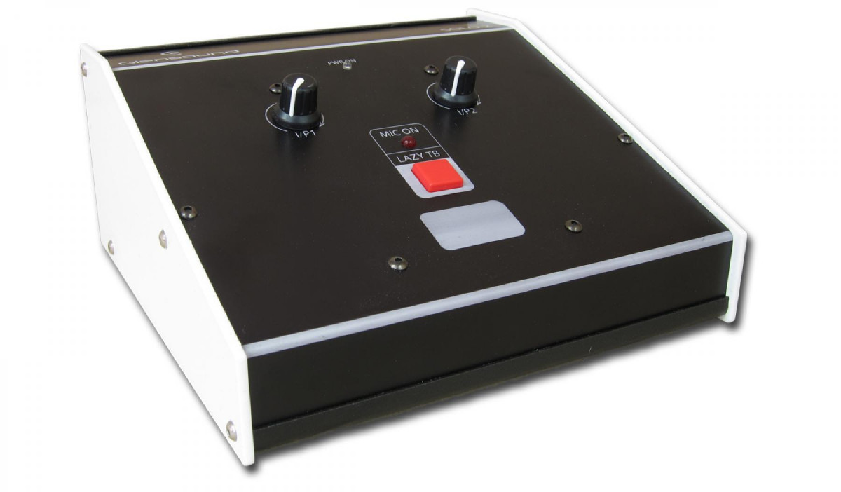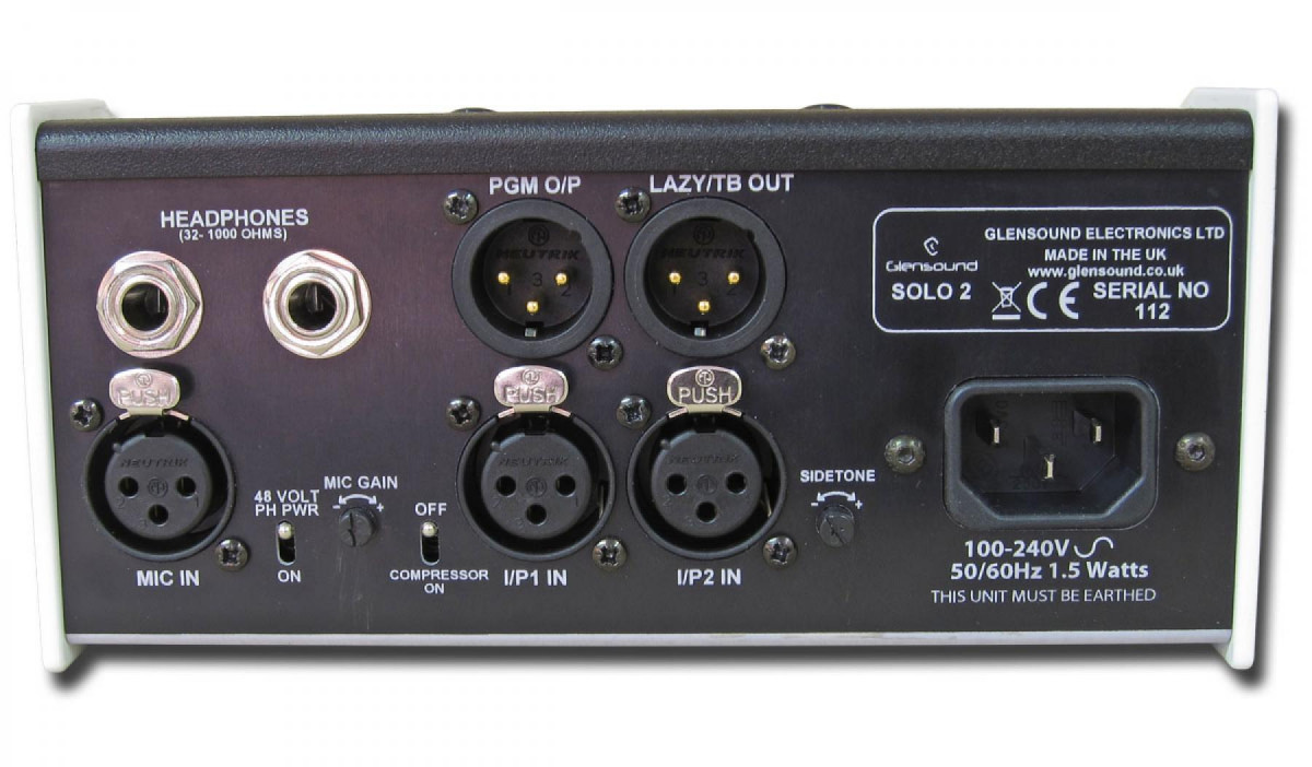 A transformer balanced high quality microphone amplifier is provided for the commentator's microphone, it has a rear panel gain control for level setting, the option of switching in +48V phantom power and the popular Glensound Referee compressor/ limiter circuit (which can be turned off via a rear panel switch). A single front panel switch routes the output of the microphone amplifier to 2 separate transformer balanced outputs (Programme & Lazy). A large bright front panel LED indicates when the microphone's output is being routed to the programme output. Side tone (the commentator's own voice in his/her own headphones) is also included, the level of which can be adjusted by a rear panel preset potentiometer.