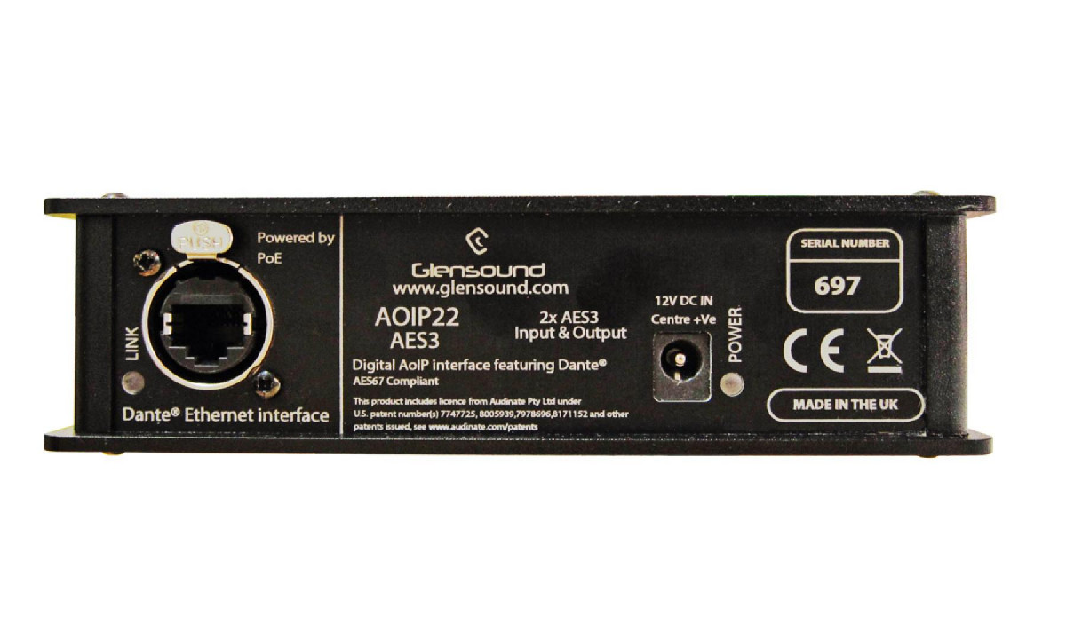 The AoIP22 AES3 is designed to easily and quickly interface existing AES3 equipment to a Dante® / AES67 network audio system. Being powered by PoE means that only one cable needs to be connected to the network to carry both audio and power, providing flexibility and saving time on installation.