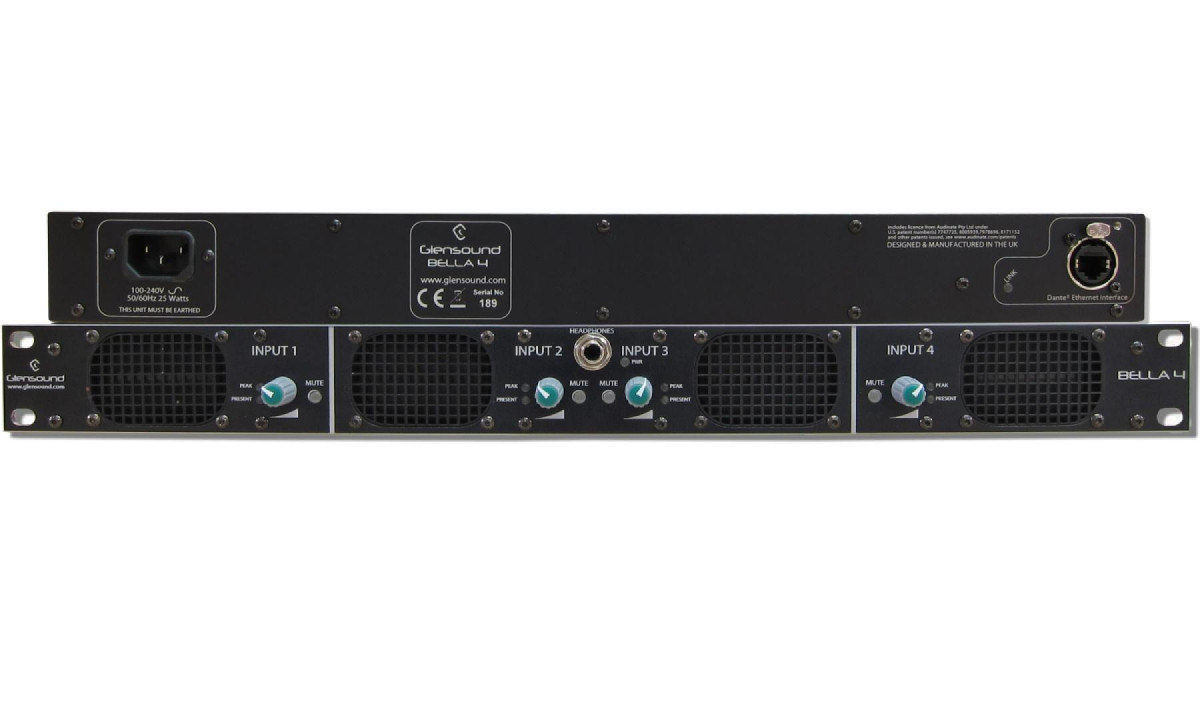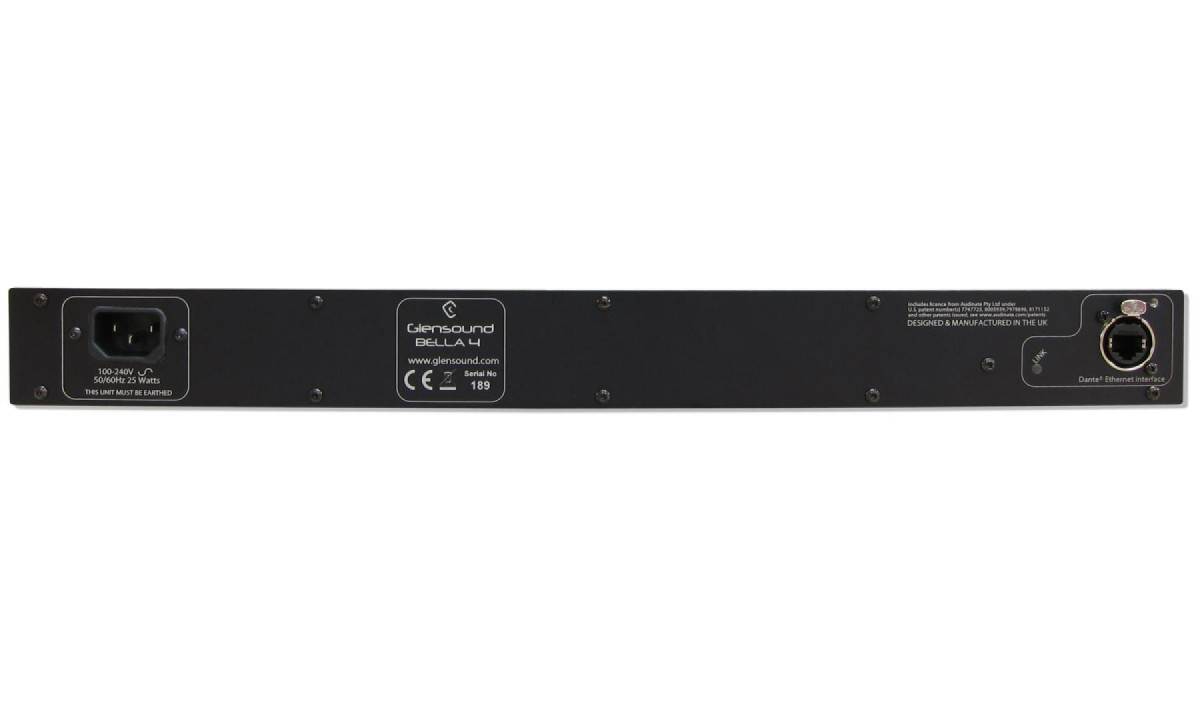 4* network audio inputs can be routed from your Dante®/ AES67 AoIP network to the Bella 4. The Bella 4 uses the Ultimo chipset from Audinate and can accept 4 audio inputs at 48k sampling or 2 at 96k sampling, all with up to 24 bit resolution.