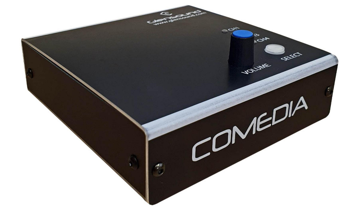 Internally a Digital Signal Processor (DSP) takes particular care of the audio signals, including state of the art compression and limiting circuits. Control of setup and day to day operation of the Comedia is also available on our Windows 10 application Glensound Controller including the ability to group together multiple Comedia units and control their level simultaneously. The rugged and lightweight aluminium enclosure has holes to allow for wall or ceiling mounting.