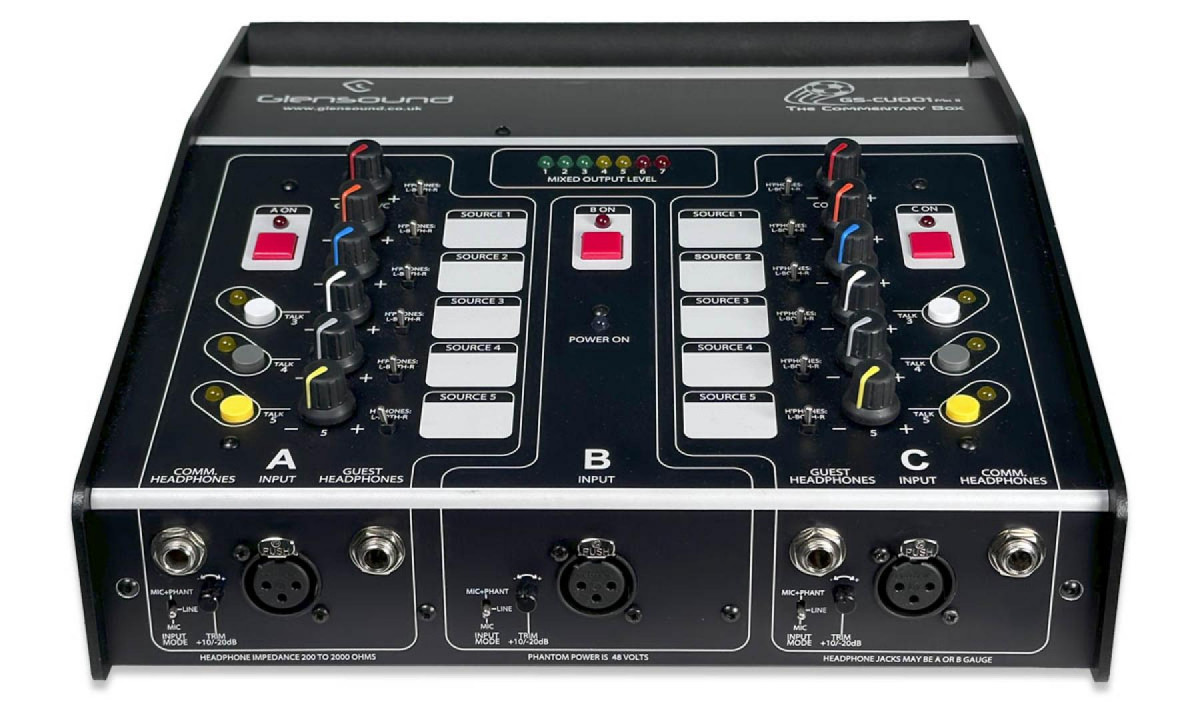 There are two main commentator monitoring sections, each with two separate 6.35mm A or B gauge jack sockets for headphones. In this way, the centre position B commentator can choose to share the monitoring of commentator A or C. There are 5 common external sources available for monitoring, plus an additional control which is the sum of the other 2 commentators/inputs. Each of the 6 pots has variable level control and left/both/right switching allowing commentator A and C to achieve their desired mix and balance levels. The sidetone control is located on the rear panel for commentator A and C to adjust the level of their own voice. There is a 7 segment LED PPM meter.