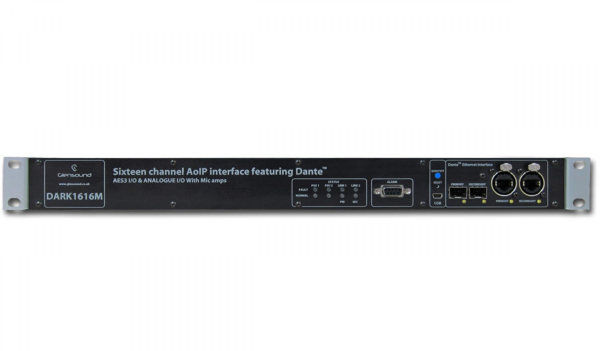 Being designed for resilient broadcast applications the DARK1616M features both redundant power supplies and redundant Dante network links with link status GPOs (general purpose outputs (solid state relays)). Both primary and secondary network links are provided with both magnetic (copper RJ45) and fibre (SFP) interface connections. The Dante system itself provides a completely transparent redundant link system which means that if the DARK1616M lost its primary link circuit the secondary link would automatically take over with no loss of audio.