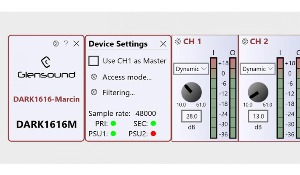 The analogue inputs are switchable between mic, line and 48V phantom power. These are controllable across the network via the Dark Controller Windows 10 app. This allows remote control by an engineer of the input selection, gain adjust and input on/off control. A meter is also provided for each input on the app, to monitor the input level and help with setting the gain.