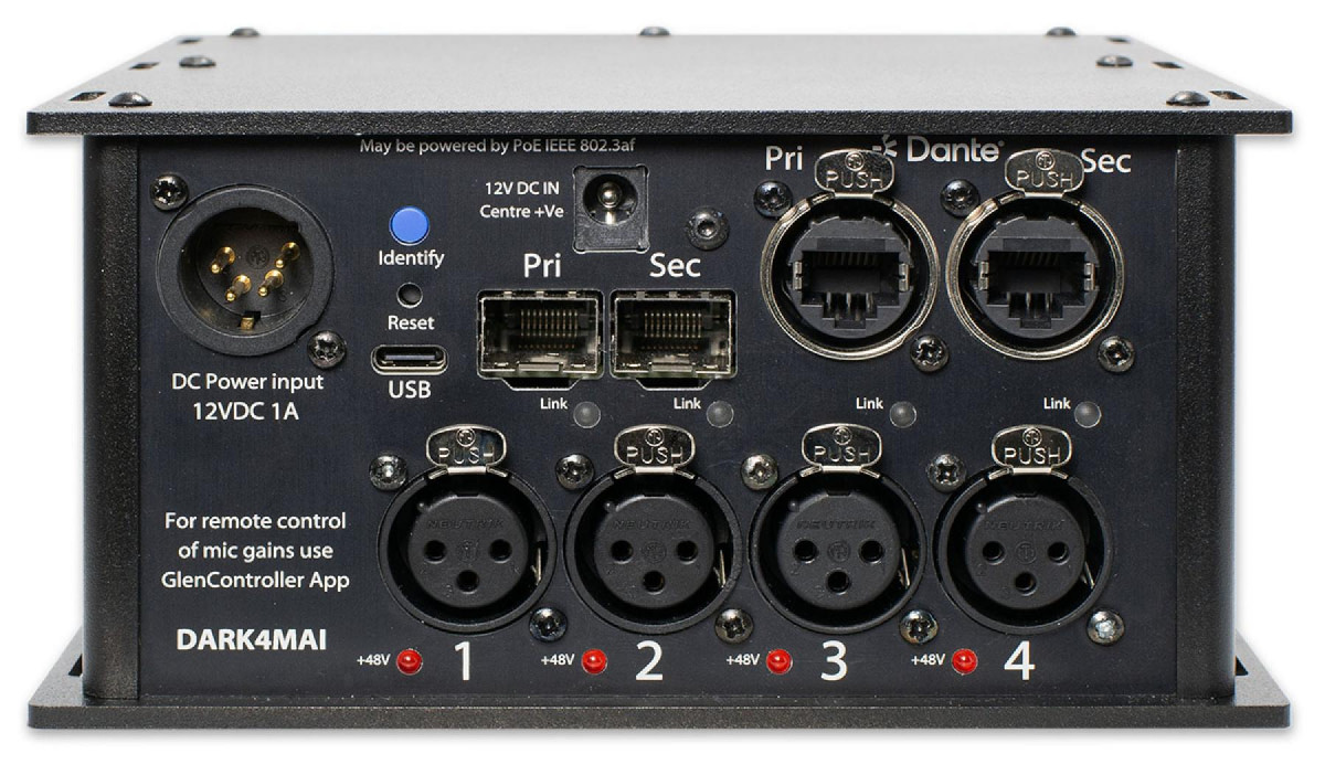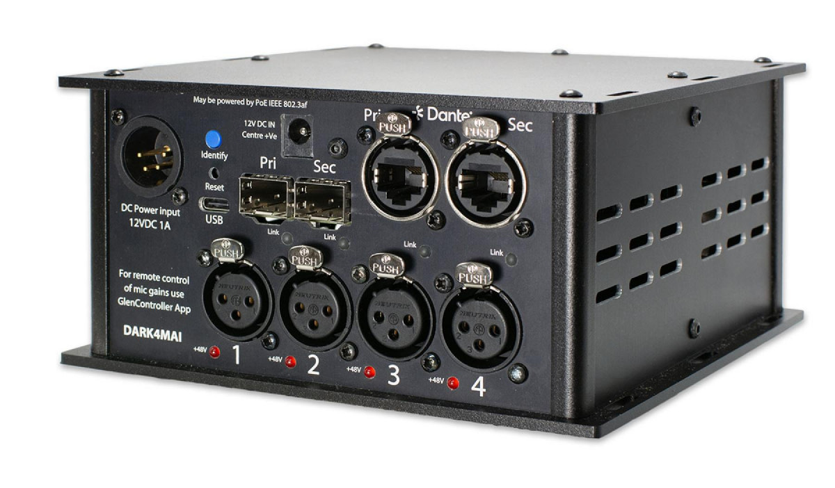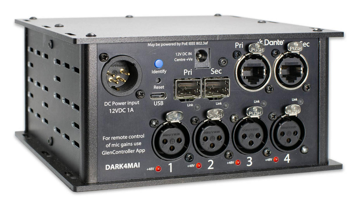 The DARK4MAI MKII (Microphone Analogue Input) is a very powerful compact Dante/ AES67 network audio interface, in a robust stage box/ throw down style. It has 4 off low noise mic/line inputs which are remotely controlled by a Windows 11 app. The outputs of the microphone amplifiers are transmitted on a fully redundant Dante/ AES67 network interface.