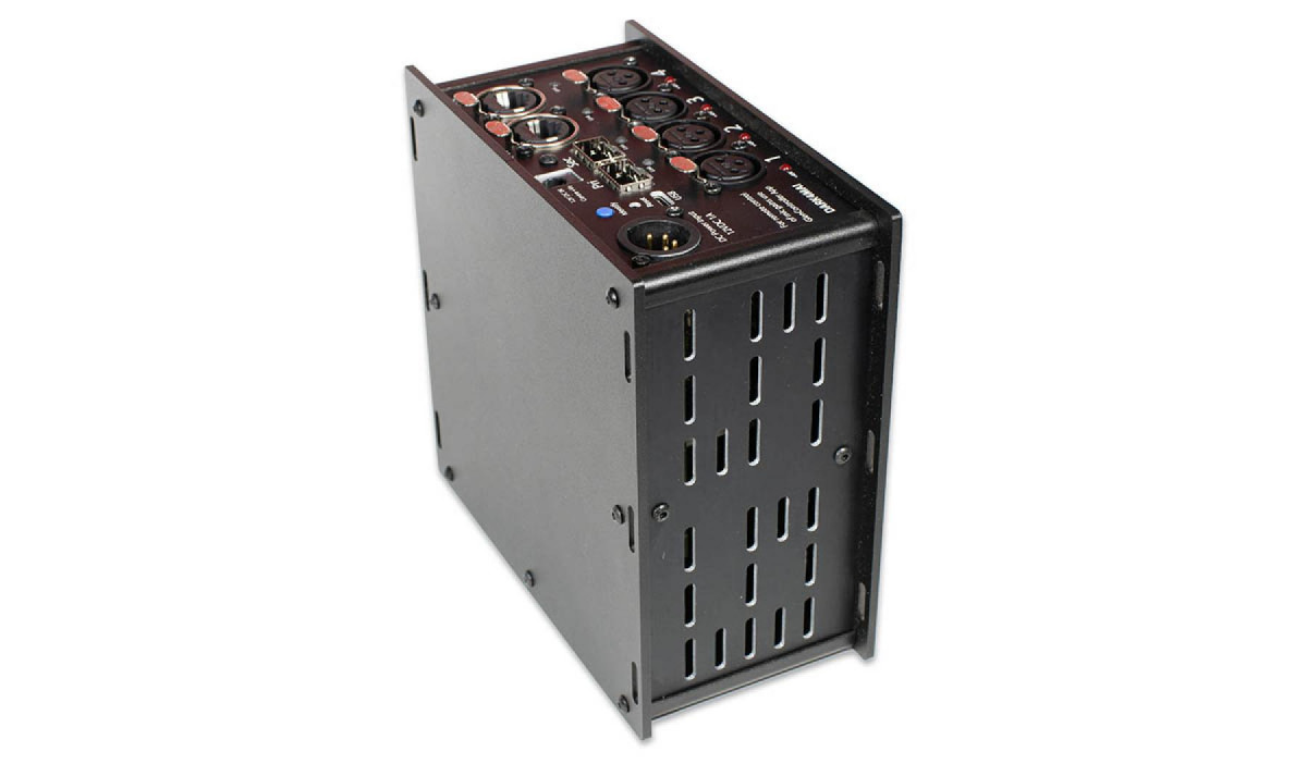 DARK4MAI MKII can be powered from independent sources to provide a redundant power option. Each copper RJ45 network socket can accept PoE (this means that just 1 cable can carry power and audio data to/ from the unit). A 12V DC input on 4 Pin XLR is also provided for powering the unit from an external DC source if no PoE is available.