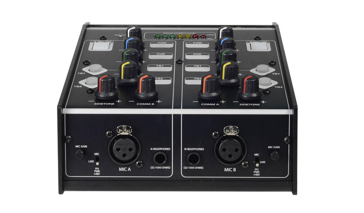 Each microphone input has its own compressor/ limiter circuit to prevent audio overload by an excited commentator.