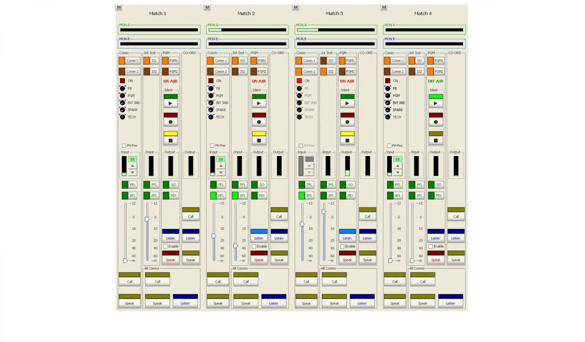 You can remote control and monitor, levels and audio. The visual mixer representation shows real time settings of the dCU3 and the dCCU, allowing engineers to see the commentators pot positions, monitor and adjust mic gain levels, turn on or off mic phantom power, monitor any input into the dCU3, and adjust the output mix level, for example. What's more an engineer is an active participant in the system, as the remote link also carries uncompressed audio (2mb sec each way), allowing the engineer to talkback on any of the 4 circuits, talkback to any commentator, or record the line idents, for example.