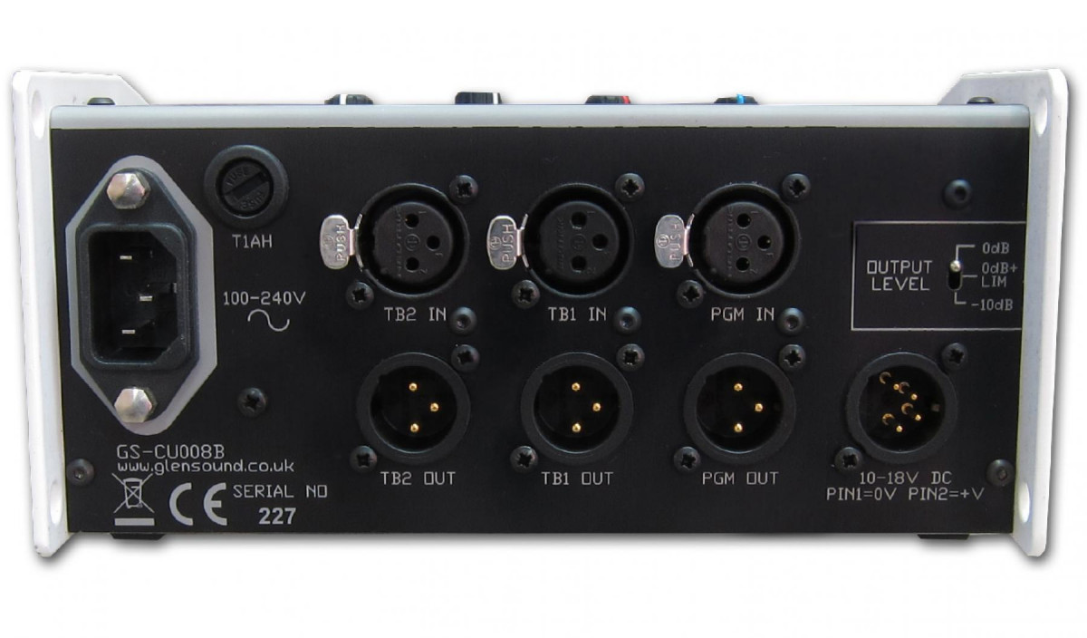 There is a single transformer balanced programme output. The output level is configurable by a three position selector switch which would typically be used with the compressor / limiter active above 0dB. The limiter can also be turned off for a 0dB output. If the compressor / limiter is not required, but more headroom is, the user can select a -10dB output without compressor/limiter. There are two talkback circuits with top panel push buttons and rear panel XLR outputs. Talkback buttons feature Config+ and can be configured as either lazy or momentary.