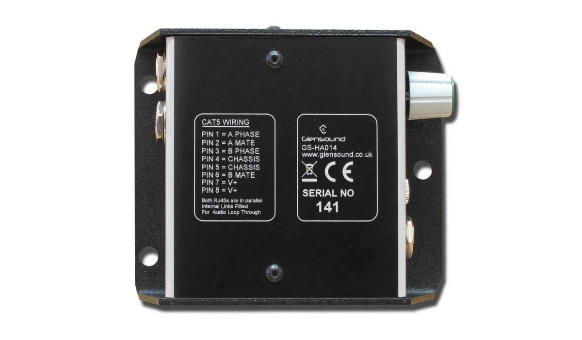 The GS-HA014 is suitable for use with a wide range of input levels, a pair of preset gain controls accessed via small holes in the top of the unit allow both broadcast (0dB) and domestic (-10dB) input levels to be accommodated.