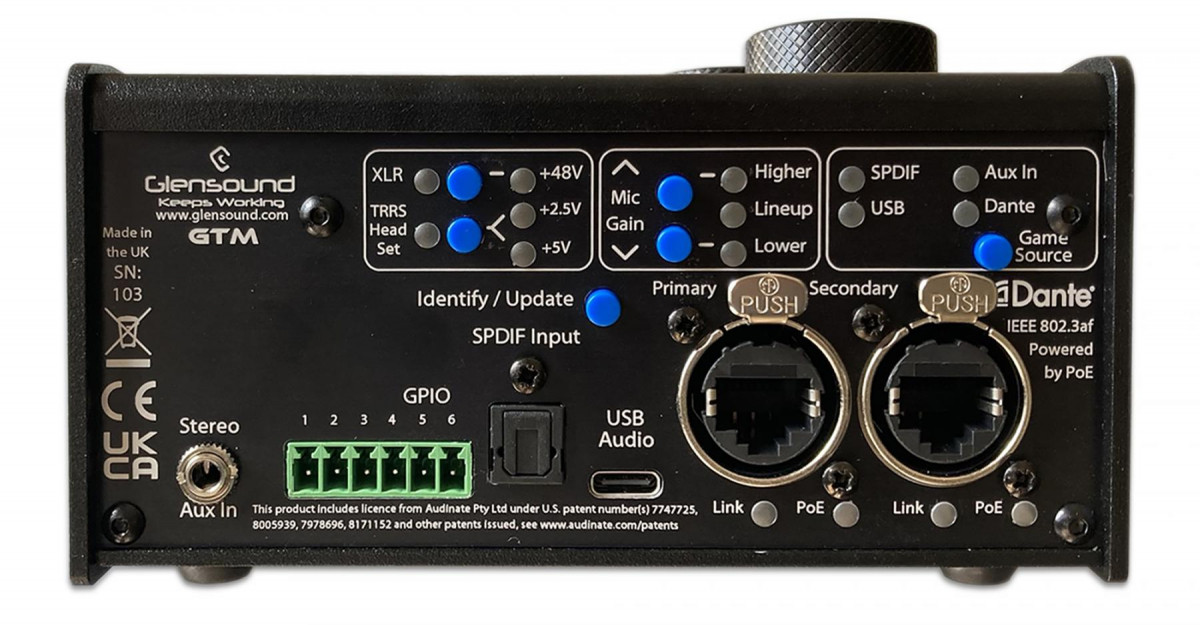 The GTM combines the multiple functions required for the interfacing and communications required in eSports tournaments into one simple to use device. GTM provides the interface for the gamers, provides the intercom mix, and allows remote control by tournament engineers. There are separate modes that also mean the GTM can be used by the Coaches, Referees, and arena Announcers.