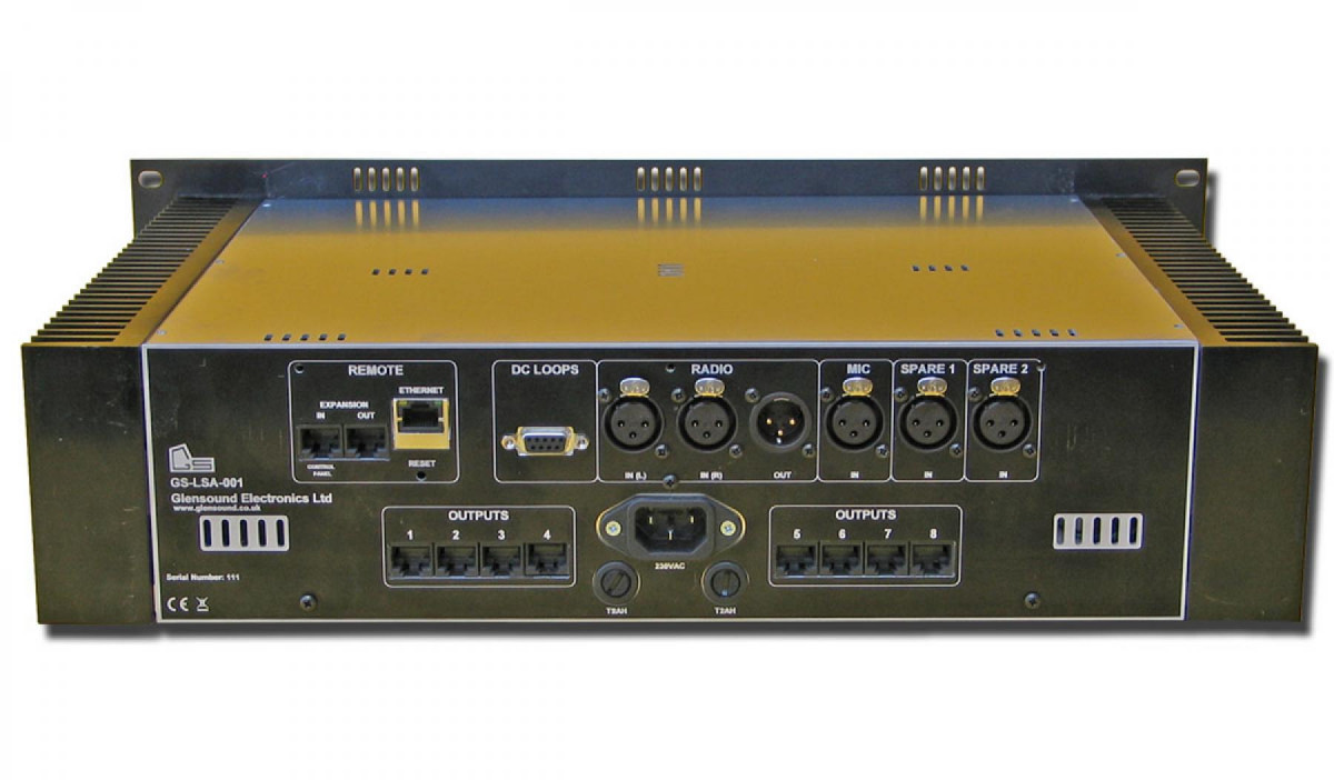 There are 8 loudspeaker outputs. Each fed from its own amplifier. For ease of installation the outputs are on RJ45 connectors (cat5). To allow enough power to be supplied to the loudspeakers an audio transformer is required at the loudspeaker (see loudspeakers/ volume remote control). Each output can be set to have its own standard level. This level is set in software during initial installation (it can of course be easily changed via the network later if required). At the start of each day the loudspeakers output is returned to this standard level.
