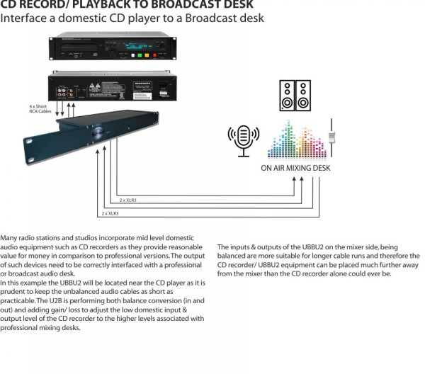 As well as providing the balancing interface the UBBU2 also provides variable gain/ loss to allow the two connected pieces of equipment to match audio levels.