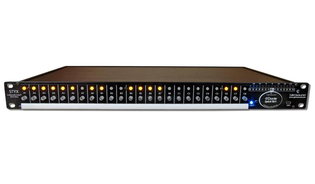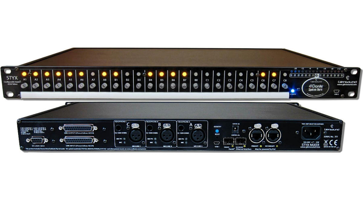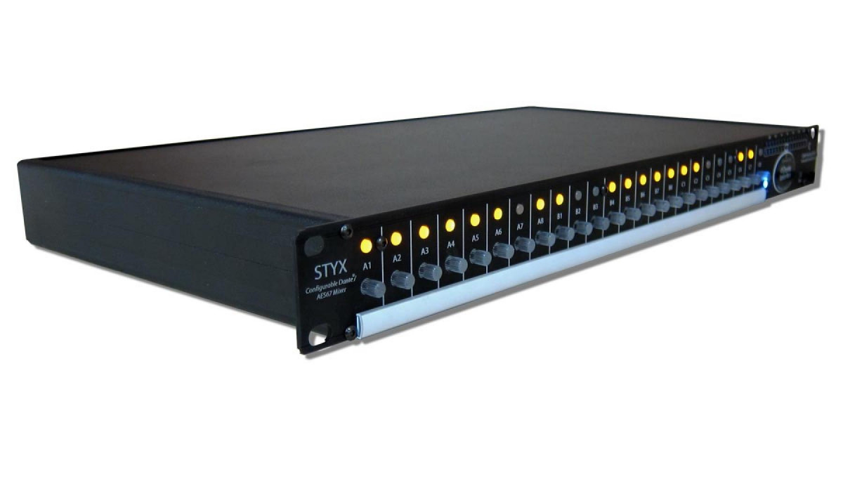 STYX (pronounced sticks) is a hugely versatile configurable 47 x 45 mixer/ utility device with 32 x 32 network audio inputs & outputs with the added benefit of 5 x 5 analogue line level circuits, 2 x 2 AES3 circuits, 3(+3) x microphone/line inputs, & 3 stereo headphone outputs.