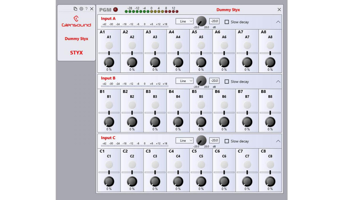 The real power of STYX is its Windows 10 application which in real time can adjust any of the 2115 mixer cross point levels, provides many setup options, and importantly, allows presets to be stored and recalled.