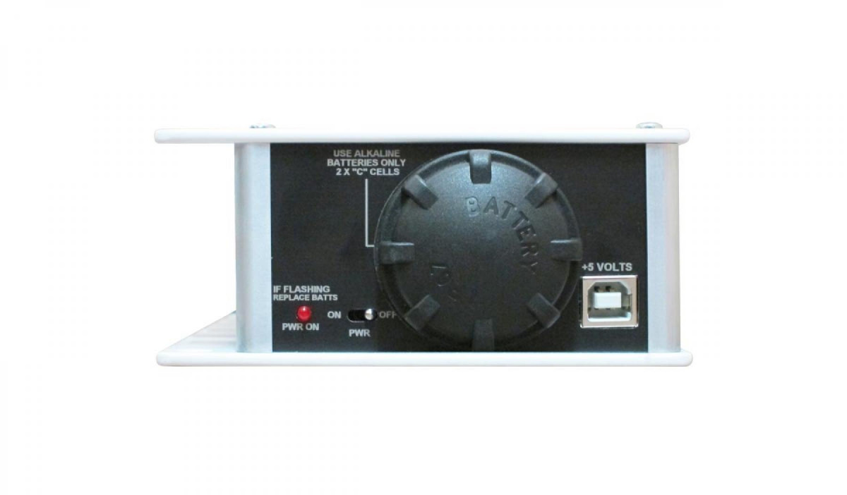 The Top Hat M3 is powered by 2 x C cell batteries or optional external DC power. As the battery level decreases there is a lower power LED for indication; as the level drops, the LED will start to flash faster and faster.