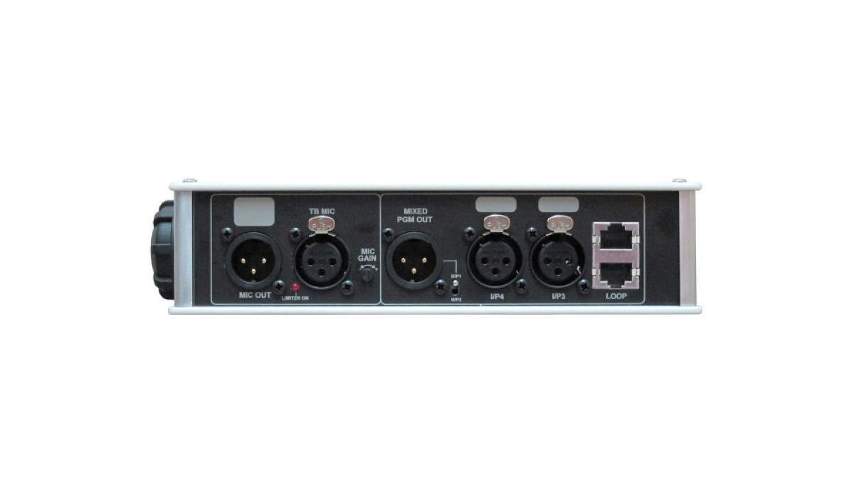 There is an XLR input for a talkback mic with adjustable gain control and a compressor/limiter. The talkback mic is switched to the XLR talkback mic output via a front panel lever key. The lever key is momentary when pushed down and locks when pushed up.