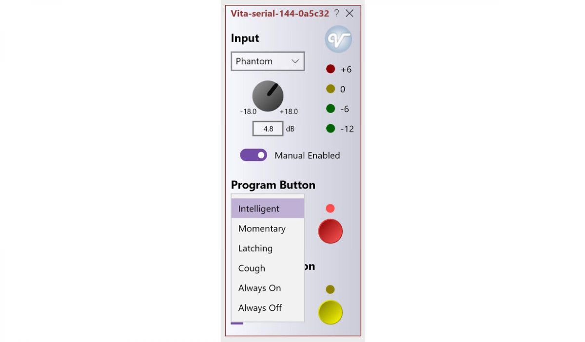 The VITA PLUS has two 4 wire circuits. These are typically used as main programme on air, with a separate talkback circuit. The push buttons for each circuit are configurable and can operate in different modes, to allow configuration for different types of uses: